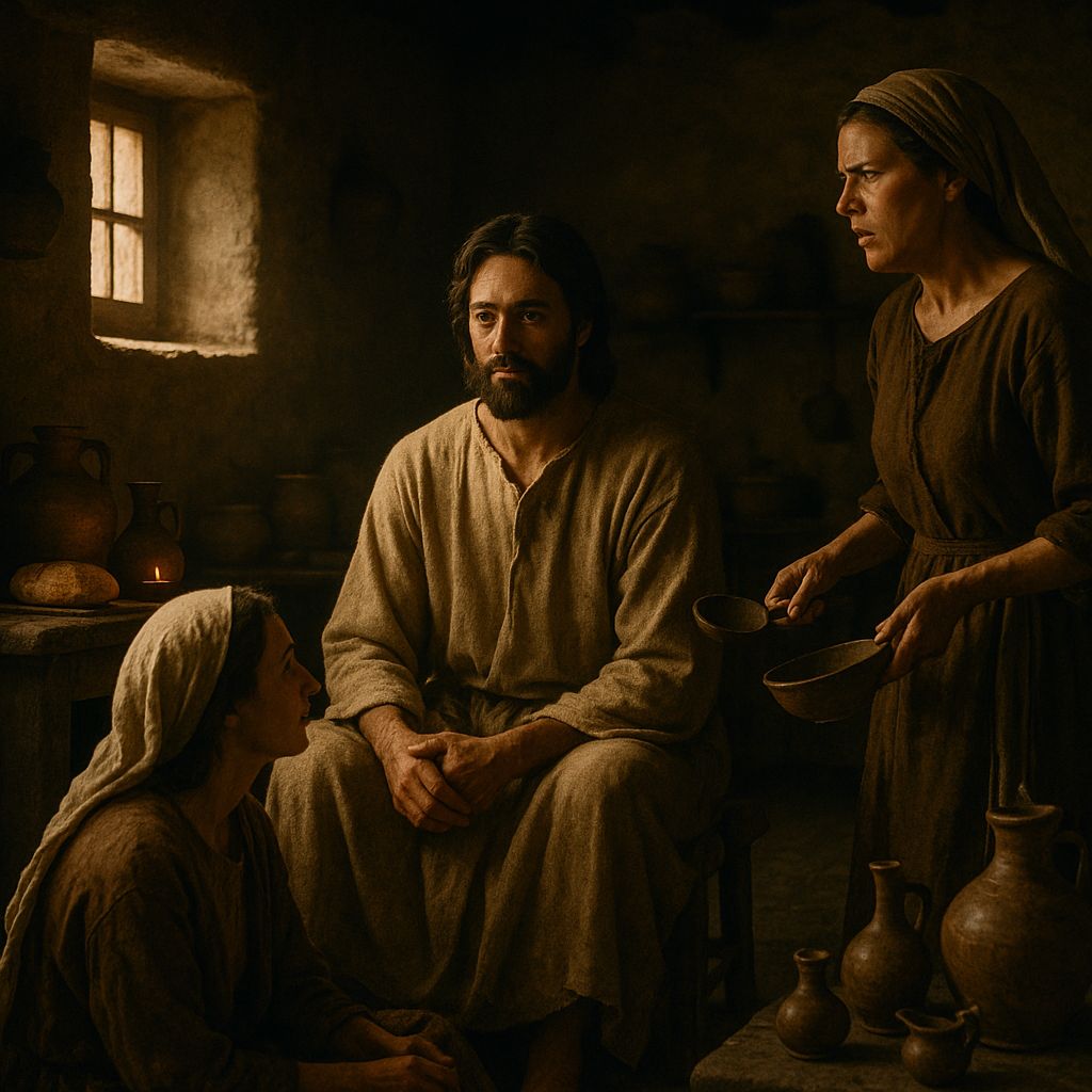 En aquel tiempo, entró Jesús en un poblado, y una mujer, llamada Marta, lo recibió en su casa. Ella tenía una hermana, llamada María, la cual se sentó a los pies de Jesús y se puso a escuchar su palabra. Marta, entre tanto, se afanaba en diversos quehaceres, hasta que, acercándose a Jesús, le dijo: “Señor, ¿no te has dado cuenta de que mi hermana me ha dejado sola con todo el quehacer? Dile que me ayude”.
