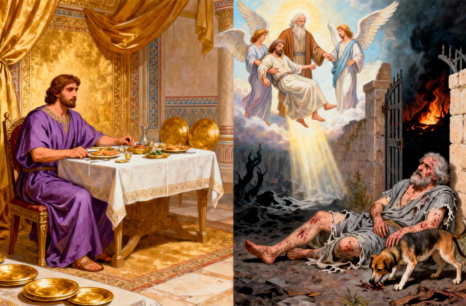 "Había un hombre rico, que se vestía de púrpura y telas finas y banqueteaba espléndidamente cada día. Y un mendigo, llamado Lázaro, yacía a la entrada de su casa, cubierto de llagas y ansiando llenarse con las sobras que caían de la mesa del rico. Y hasta los perros se acercaban a lamerle las llagas.