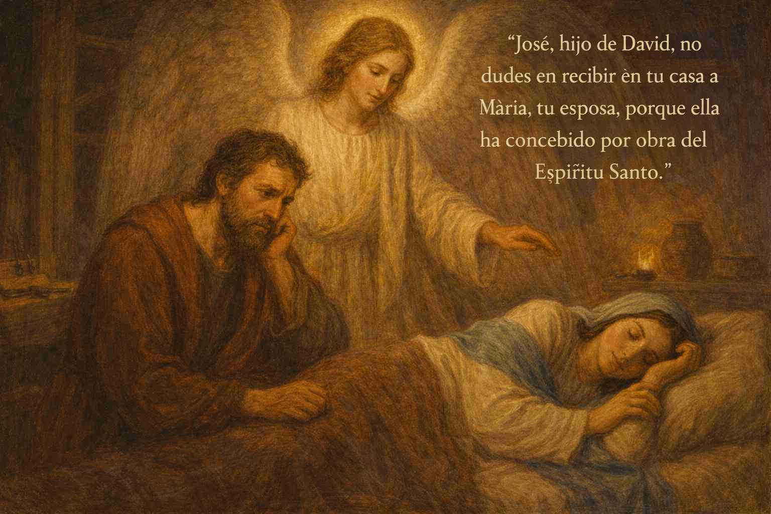 Mientras pensaba en estas cosas, un ángel del Señor le dijo en sueños: "José, hijo de David, no dudes en recibir en tu casa a María, tu esposa, porque ella ha concebido por obra del Espíritu Santo. Dará a luz un hijo y tú le pondrás el nombre de Jesús, porque él salvará a su pueblo de sus pecados".