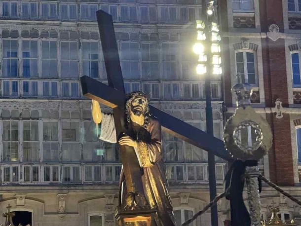 Ya en la plaza, completamente abarrotada, se vivió el momento central de la noche. La entrada de Nuestra Señora de los Dolores, seguida minutos después por la llegada de Jesús atravesando el Arco de Santa María, dio paso a una escena cargada de simbolismo: el Encuentro entre madre e hijo antes del camino definitivo hacia la Cruz.