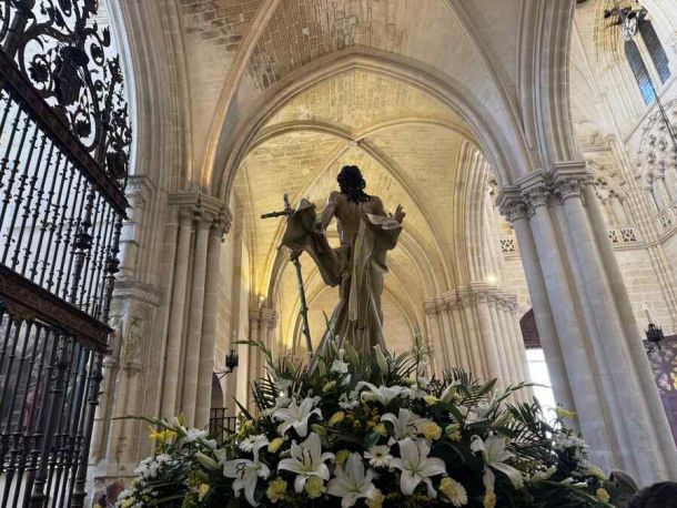Desde primeras horas de la mañana, la iglesia de la Sagrada Familia se convertía en el punto de partida de uno de los momentos más esperados del calendario litúrgico. Desde allí, el paso de Cristo Resucitado —obra de Manuel López (2005)— iniciaba su recorrido acompañado por los cofrades, dando testimonio visible del núcleo de la fe cristiana: la victoria de la vida sobre la muerte. Mientras tanto, la Virgen de la Alegría partía desde la iglesia de San Nicolás de Bari para dirigirse hacia la Catedral, donde tendría lugar el esperado Encuentro. Tras la celebración eucarística de Pascua que se celebró en la Catedral, la imagen de María aguardaba ya a las puertas del templo, en un ambiente cargado de expectación.